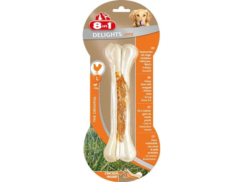 Die optimal auf über 25 kg wiegende grosse und sehr grosse Hunde zugeschnittenen extra harten 8in1 Delights Chicken Bones Strong L aus leckerer Rinderhaut und köstlicher Hähnchenbrust stehen für ausgiebigen, lang anhaltenden Kauspass. Aufgrund ihrer festen Konsistenz sind die leckeren Kauknochen schwer zu kauen und eignen sich daher perfekt für Hunde mit besonders ausgeprägtem Kauinstinkt. Aber nicht nur das: Während die Kauknochen Ihren Hund genüsslich beschäftigen, unterstützen sie gleichzeitig die Zahnpflege. Denn durch den mechanischen Abrieb beim Kauen wird auf natürliche Weise Zahnstein entfernt. Auf diese Weise tragen die Kauknochen zur Zahngesundheit Ihres Hundes bei. Die fettarmen, köstlichen 8in1 Delights Chicken Bones Strong L eignen sich hervorragend, um Ihren Hund zu belohnen. Die im Ofen gegarten Kauartikel sind reich an Proteinen, frei von künstlichen Farbstoffen und Geschmacksverstärkern und ohne Zusatz von GVO und Gluten.