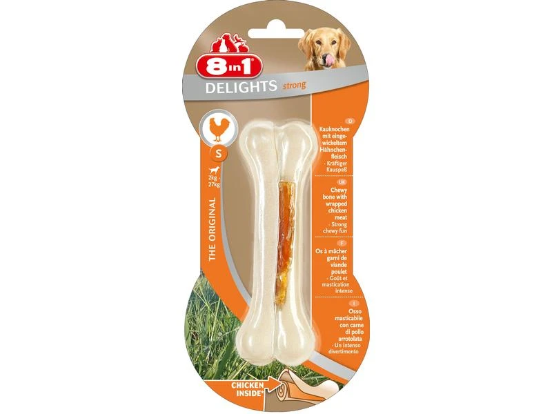 Die optimal auf zwischen 5 kg und 10 kg wiegende kleine Hunde zugeschnittenen extra harten 8in1 Delights Chicken Bones Strong S aus leckerer Rinderhaut und köstlicher Hähnchenbrust stehen für ausgiebigen, lang anhaltenden Kauspass. Aufgrund ihrer festen Konsistenz sind die leckeren Kauknochen schwer zu kauen und eignen sich daher perfekt für Hunde mit besonders ausgeprägtem Kauinstinkt. Aber nicht nur das: Während die Kauknochen Ihren Hund genüsslich beschäftigen, unterstützen sie gleichzeitig die Zahnpflege. Denn durch den mechanischen Abrieb beim Kauen wird auf natürliche Weise Zahnstein entfernt. Auf diese Weise tragen die Kauknochen zur Zahngesundheit Ihres Hundes bei. Die fettarmen, köstlichen 8in1 Delights Chicken Bones Strong S eignen sich hervorragend, um Ihren Hund zu belohnen. Die im Ofen gegarten Kauartikel sind reich an Proteinen, frei von künstlichen Farbstoffen und Geschmacksverstärkern und ohne Zusatz von GVO und Gluten.