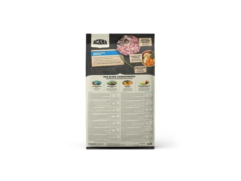 Genau wie seine wilden Vettern, ist Ihr Hund ein Fleischfresser und biologisch an eine Ernährung, die reich und vielfältig an frischem, ganzem Fleisch ist, angepasst. ACANA ist randvoll mit frischem Freilandhuhn, wild gefangener Flunder und ganzen Nest-Eiern in “Whole Prey“ Portionen. Alle zutaten stammen von Farmern und Fischern aus der Region. Frei von Getreide und schnellen Kohlenhydrate wie Reis, Tapioka oder Kartoffel ist ACANA reich an Fleisch-Proteinen, um die Muskelmasse und eine optimale Kondition zu fördern. Aus Kanadas besten und frischesten Zutaten hergestellt, hält das Biologically Appropriate ACANA Ihren Hund garantiert glücklich, gesund und stark. Völlig frei von Pflanzenproteinkonzentraten ist ACANA Adult Dog mit 60% Fleisch gefüllt – das ist doppelt so viel wie die meisten herkömmlichen Hundenahrungen beinhalten. 1/3 des Fleisch in ACANA ist frisch und liefert wichtige Nährstoffe in seiner nährenden Form und 2/3 werden getrocknet, um eine starke und natürliche Quelle für Fleischprotein bereitzustellen. ACANA verfügt über Frischfleisch im WholePrey Verhältnis und beinhalted Fleisch, Organe und Knorpel welche Nährstoffe natürlich und vollständig liefern. Freiland Huhn – Fleisch, Leber, Herz, Niere und Knorpel, frisch aus der heimischen Landwirtschaft. Ganze Nest-Eier – frisch von lokalen Präriefarmen und wilde Flunder – ganz und frisch aus dem Norden von Vancouver Island. In der Natur gibt es keine synthetischen Nahrungsergänzungsmitteln und Hunden und Wölfen stillen ihre ernährungsphysiologischen Bedürfnisse durch den Konsum von Beutetieren; Muskelfleisch bietet Protein; Leber, Nieren und Kutteln versorgen mit Vitaminen und Mineralstoffen; Knochen und Knorpel liefern Kalzium und Phosphor.