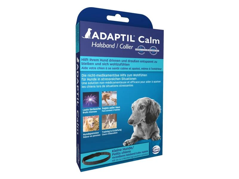 Das ADAPTIL Calm Halsband hilft Hunden draussen ruhig und entspannt zu sein, z.B. bei lauten Geräuschen, beim Hundetraining, in der Hundepension oder bei anderen Unsicherheiten und Ängsten. Wissenschaftlich bewiesen und von Tierärzten verwendet und empfohlen.