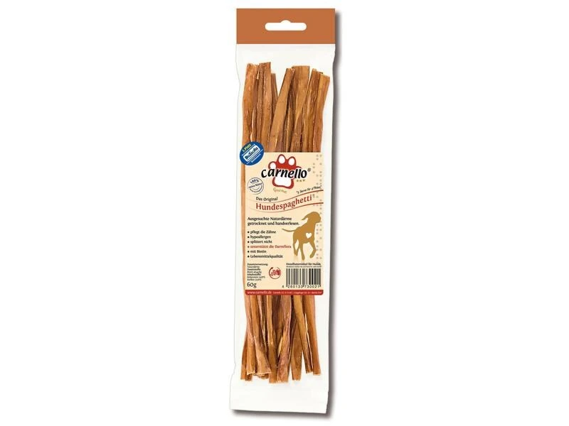 Hundespaghetti aus handverlesenen Schweinedärmen ist eine Kauspezialität in Gourmet-Qualität und gesunder Leckerbissen für alle Hunde. Vergleichbare Produkte werden oft chemisch behandelt und im Schnellverfahren getrocknet, teilweise nur 2 Stunden lang. Sie sind staubtrocken und können gefährlich splittern. Die chemischen Zusätze tragen auch bei den Tieren zu Zivilisations-Krankheiten,