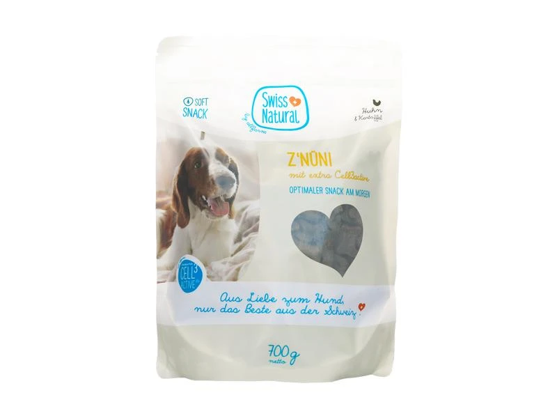 Z’Nüni von Dog’s Health ist der optimale Snack für Ihren Hund auf Ihren täglichen Spaziergängen oder wenn er sportlich aktiv ist. Natürliche Aufbaustoffe unterstützen das Immunsystem Ihres vierbeinigen Lieblings und stärken ihn so für jede Lebenslage. Vom Welpen, ausgewachsenen Hund bis zum aktiven Hundesportler.