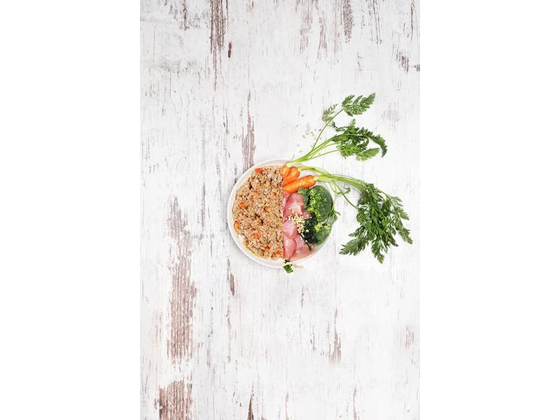 | Inhaltsstoffe | Vit. A 2.025 IE, Vit. D3 136 IE, Zink (als Zinksulfat, Monohydrat) 20 mg, Kupfer (als Kupfer-(II)-Sulfat, Pentahydrat) 1 mg Verhältnis Fleisch: Gemüse/Obst : übrige Rohstoffe = 61% : 35% : 4% |