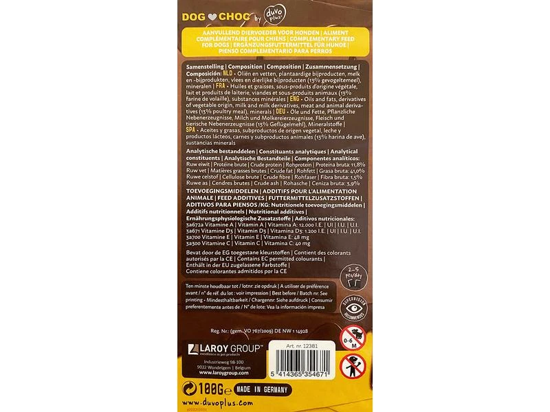 Möchten Sie Ihren Hund mit «Schokolade» überraschen, die für Hunde sicher ist? Dann haben wir gute Nachrichten für Sie! Sie können den leckeren Dog Choc Snack in Form eines Schokoriegels problemlos mit viel Liebe Ihrem Liebling geben. Dieser verantwortungsvolle, europäische Snack wurde mit Hühnerfleisch und Vitaminen angereichert und enthält keinen zugesetzten Zucker. Dog Choc von duvoplus ist in verschiedenen Geschmacksvarianten erhältlich.