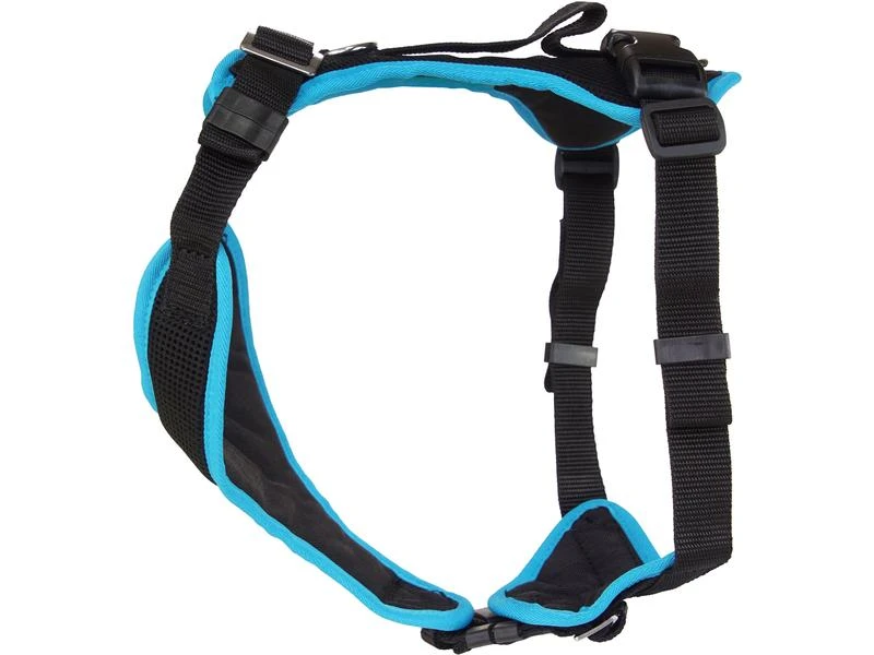Das Geschirr Popp-it besteht aus drei individuell verstellbaren Teilen. So wachsen während dem ersten Lebensjahr, Halsweite und Brustteil-Länge des Geschirrs optimal mit. Ist der Hund dann ausgewachsen, kann auf ein anderes Geschirr gewechselt werden. Dieses Geschirr bietet volle Bewegungsfreiheit bei allen Aktivitäten. Dank dem langen Schnitt ist das Schulterblatt, Schulter- und Ellenbogengelenk immer frei und der Welpe kann sich uneingeschränkt bewegen. Gefertigt ist es aus leichtem Gewebe. Die Bauchgurte werden locker eingestellt, sodass der Welpe nie Druck auf der Wirbelsäule verspürt. Es werden nur hochwertige, stabile Steckverschlüsse, welche grossen Belastungen standhalten verwendet. Für den alltäglichen Gebrauch sollte die Leine nur am hinteren Ring befestigt werden. Gibt es so Zug auf die Leine und aufs Geschirr, verteilt sich dieser optimal auf dem Hundekörper. Der sensible Hals bleibt frei. Um den Welpen kurz zu führen, können die beiden Karabiner der Führleine je am vorderen und hinteren Ring befestigt werden. Den vorderen Ring alleine zu benutzen, wird nur für Ausbildungszwecke empfohlen – z.B. auf dem Hundeplatz. Denn wenn nur auf den vorderen Ring Zug ausgeübt wird, wird das Geschirr am Hals nach oben gezogen und drückt dem Welpen auf die Luftröhre, wie ein Halsband.