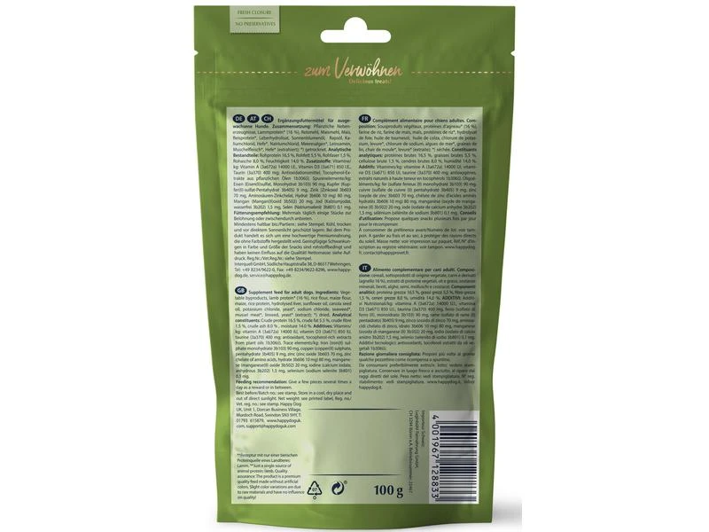 | Zusammensetzung | Pflanzliche Nebenerzeugnisse, Lammprotein* (16%), Reismehl, Maismehl, Mais, Reisprotein*, Leberhydrolisat, Sonnenblumenöl, Rapsöl, Kaliumchlorid, Hefe*, Natriumchlorid, Meeresalgen*, Leinsamen, Muschelfleisch*, Hefe* (extrahiert); *) getrocknet. |