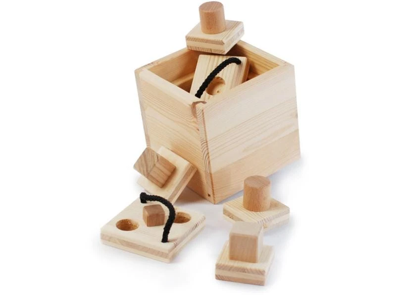 Der Hund soll mit der Schnauze erst die 4 kleinen Deckel wegnehmen, um an die nächstkleinere Box zu gelangen. Danach muss er an der Schnur ziehen, um wieder eine Stufe nach unten zu gelangen. Hier angekommen, ist wieder ein Deckel zu entfernen, um an die Schlussbelohnung ganz unten in der Box zu kommen.
