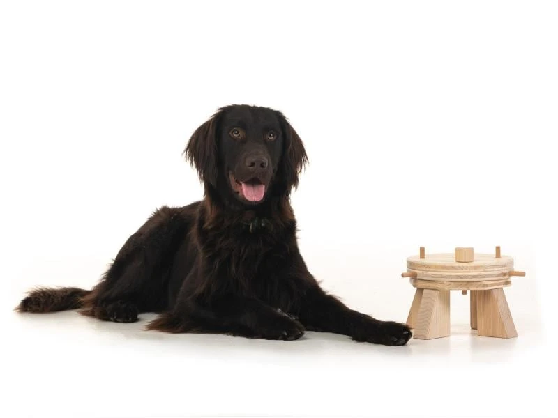 Der Hund muss erst einen Sperrdübel entfernen und dann die obere Platte entweder von oben oder der Seite drehen, damit die Goodies durch ein Loch in der unteren Platte rausfallen.