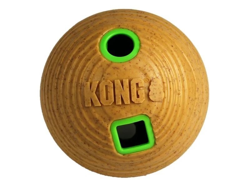 KONG Bamboo aufschrauben und mit Trockenfutter oder Leckerchen befüllen. Diese werden für den Hund auf unwiderstehlich und unberechenbare Weise abgegeben, was zu aktivem Spiel sowie geistiger und körperlicher Beschäftigung animiert. Der KONG Bamboo kann mit Trockenfutter für eine verlangsamte Nahrungsaufnahme benutzt werden. Das haltbare Material mit Bambus bietet eine natürlich Variante von interaktivem Hundespielzeug, welche Geräusche für leiseren Spielspass dämpft.