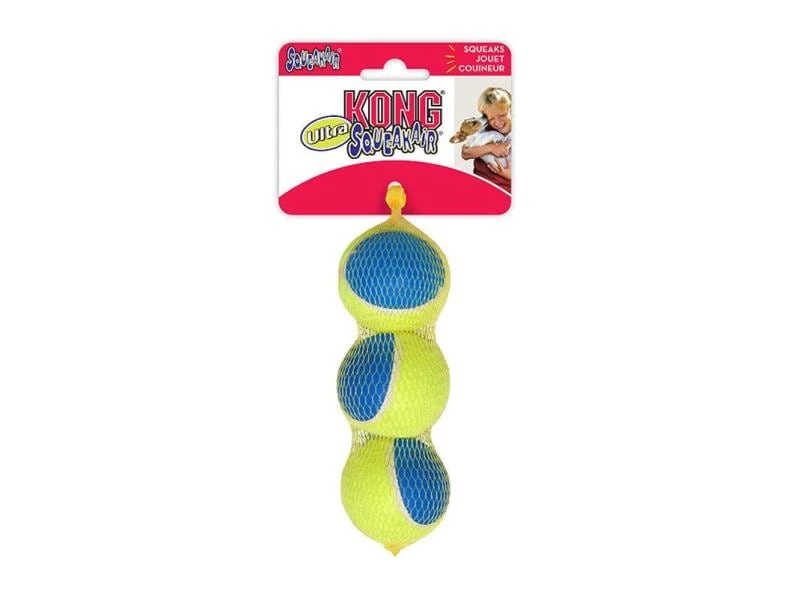 Die Kong Ultra SqueakAir Balls sind besonders robuste, Tennisball-grosse Spielzeuge für Ihren Hund. Dank ihrer unterschiedlichen Texturen sind die Bälle für Hunde einfach unwiderstehlich und bieten eine langanhaltenden Spielspass. Quietschgeräusche sorgen für reichlich Spass bei Apportierspielen. Dank speziellem, nicht scheuerndem Filzstoff werden die Zähne und das Zahnfleisch beim Spielen geschont.