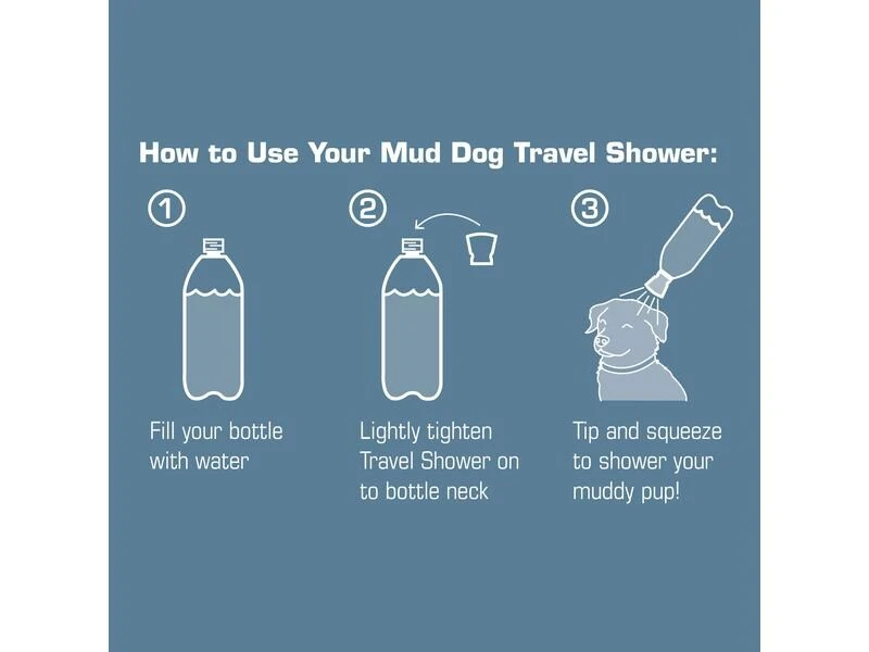 Holen Sie sich eine Dusche, wo und wann immer Ihr Hund eine braucht, indem Sie mit der Mud Dog Travel Shower fast jede Plastikflasche in eine praktische Dusche verwandeln. Schrauben Sie einfach die Reisedusche auf und voila – es ist, als hätte es nie ein Toben im Schlamm gegeben.