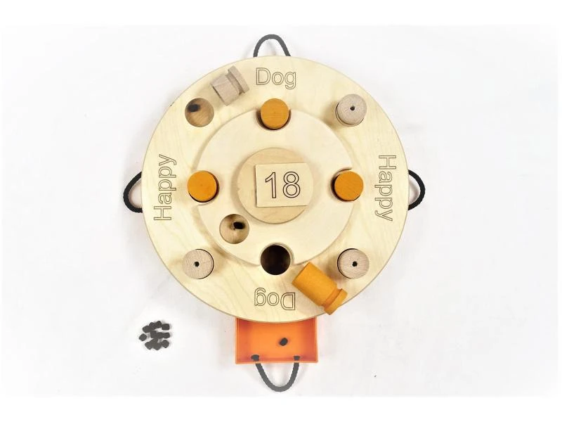 Das Spiel besteht aus einem runden Sockel mit 4 Schubladen und einer beweglichen, kleineren 2-er Ebene mit 4 Ausschnitten für Walzen. In der Mitte befindet sich ein Plättchen mit der Geburtstagszahl, unter dem in einer Vertiefung ein Leckerli versteckt werden kann. Um zu diesem Leckerli zu gelangen, muss Ihr Hund zuerst das Plättchen herausschieben. Die Schubladen in der Basis werden durch lange Walzen blockiert, die Ihr Hund zuerst entfernen muss, um die Schubladen herauszuziehen und zu den Leckerlis zu gelangen, die dort versteckt wurden. Auf der Scheibe sind weitere 4 Kerzen/Walzen unter denen auch Leckerlis versteckt werden. Die mittlere, kleinere Scheibe kann gedreht werden, wenn die 4 blockierenden Walzen (Kerzen) entfernt werden. Durch das Drehen kann der Hund in den unter der Scheibe versteckten Öffnungen zusätzliche Belohnungen herausholen. Das Spiel bietet bis zu 21 Verstecke/Hindernisse, die Ihr Hund lösen kann. Sie erhalten dazu Sticker für die Geburtsjahre von 1 bis 18.