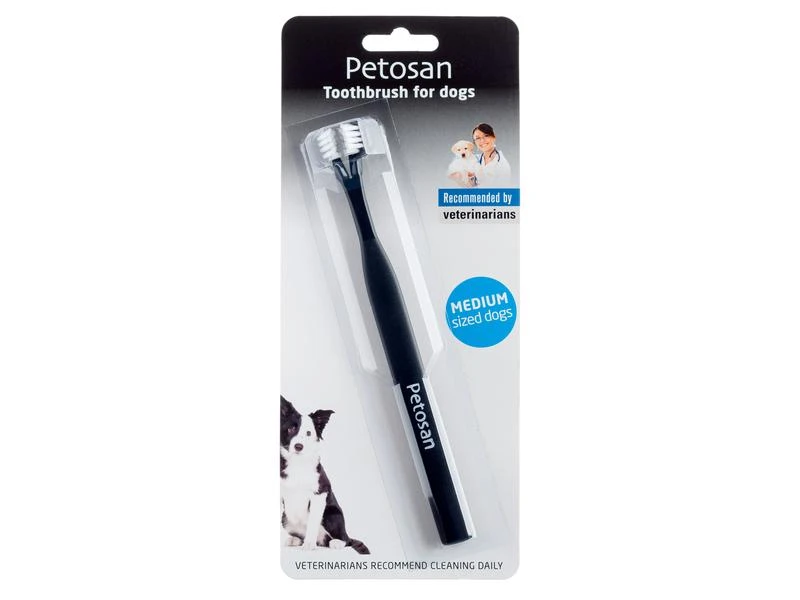 Rückseite. Nie vorher war die Reinigung und Pflege des Mundraums Ihres geliebten Haustieres so einfach und effektiv. Die Petosan Doppelkopfzahnbürste ist in drei Grössen erhältlich und damit für alle Hunde geeignet.