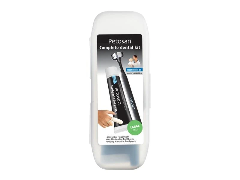 Das Petosan Complete Dental Kit wurde entwickelt, um Ihnen den Einstieg in das Zähneputzen zu erleichtern. Das Zahnpflegeset Komplett besteht aus einer 70 g Verpackung Zahnpasta, einer Fingerbürste für den Mundraum und einer Doppelkopfbürste, alles verpackt in einem spülmaschinenfesten Plastiketui.