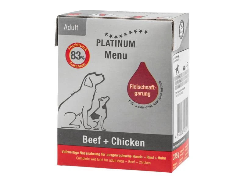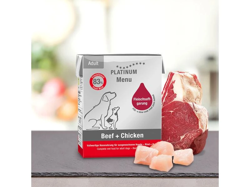 Die Nassnahrung von Platinum wird durch Fleischsaftgarung zubereitet. Fleischsaftgarung ist eine besondere Zubereitungsart von Frischfleisch, die in der Küche entstanden ist, nicht in der Futtermittelindustrie. Vorbild waren Techniken, die Spitzenköche oft verwenden, um Fleisch durch den Fleischsaft schmackhafter und auch gesünder zuzubereiten. Die Fleischsaftgarung ist eine ausgewählte Kombination dieser Zubereitungstechniken, angepasst an die körperlichen Bedürfnisse und Interessen des Hundes. Bei der Fleischsaftgarung wird Frischfleisch, wie in der Küche, nur im eigenen nähstoffreichen Fleischsaft gegart.