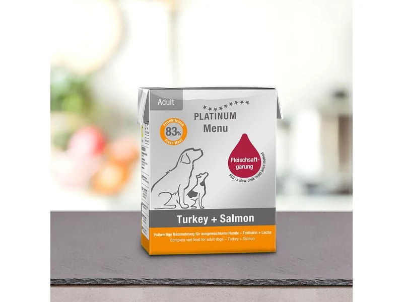 Die Nassnahrung von Platinum wird durch Fleischsaftgarung zubereitet. Fleischsaftgarung ist eine besondere Zubereitungsart von Frischfleisch, die in der Küche entstanden ist, nicht in der Futtermittelindustrie. Vorbild waren Techniken, die Spitzenköche oft verwenden, um Fleisch durch den Fleischsaft schmackhafter und auch gesünder zuzubereiten. Die Fleischsaftgarung ist eine ausgewählte Kombination dieser Zubereitungstechniken, angepasst an die körperlichen Bedürfnisse und Interessen des Hundes. Bei der Fleischsaftgarung wird Frischfleisch, wie in der Küche, nur im eigenen nähstoffreichen Fleischsaft gegart.