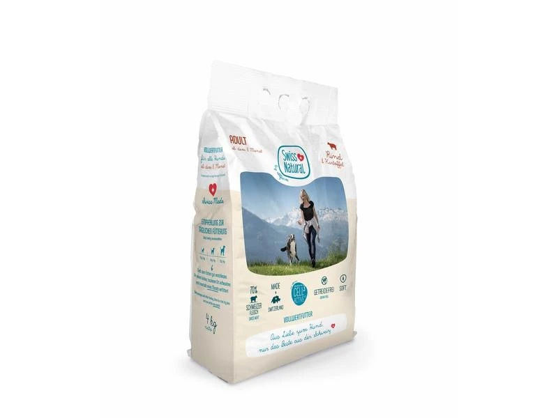 Swiss Natural Soft ADULT ist eine hochwertige getreidefreie Vollnahrung mit 70% Rindfleisch aus der Schweiz. Durch das schonende Herstellungsverfahren SOFT bleibt in den Futterbrocken bis zu 30% Restfeuchte enthalten. Mit dem Monoprotein und ImmunoCell3aktive steht dieses Futter für eine optimale Verträglichkeit.