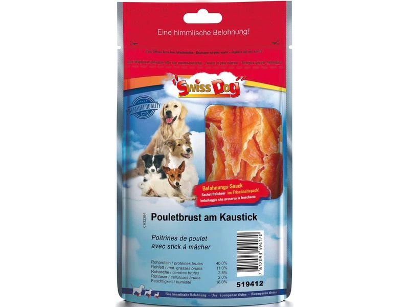 Die Pouletbrüste am Kaustick von SwissDog werden auf natürlicher Basis hergestellt und bestehen zu einem grossen Teil aus Hühnerfleisch. Aufgrund des hohen Fleischanteils besitzt dieser Snack eine sehr hohe Akzeptanz und einen besonders intensiven und natürlichen Geschmack, den Ihr Hund lieben wird. Das Hühnerfleisch sorgt ausserdem für einen hohen Anteil an natürlichen Proteinen. Aufgrund ihrer Grösse und Konsistenz müssen die Pouletbrüste von den Hunden gut gekaut werden, was sich positiv auf das Hundegebiss auswirkt, da die Kaumuskulatur trainiert und bestehender Zahnstein abgerieben wird. Die Pouletbrüste am Kaustick sind für jede Hundegrösse und Rasse geeignet. Die Verpackung ist wiederverschliessbar, so bleiben die Snacks länger frisch und Sie können sie in ihrer ursprünglichen Verpackung aufbewahren. Der enthaltene Anti-Oxygen-Absorber dient dazu zunächst die überschüssige Feuchtigkeit und dann den Sauerstoff in der Verpackung zu absorbieren, so kann die Produktsicherheit erhalten und die Haltbarkeit verlängert werden.