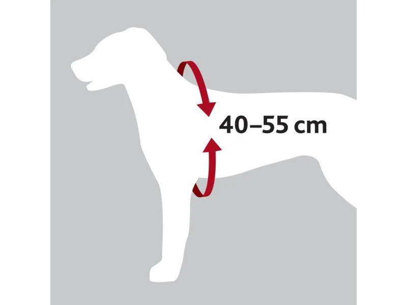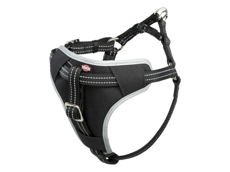 Ein spezieller Kurzführer ermöglicht die Befestigung auf Brusthöhe. Die Metallringe und -schieber sind sicher verschweisst und durch die Polsterung am Hals-, Brust- und Bauchbereich ist das Geschirr angenehm zu tragen. Mit der Zugentlastung ist es besonders belastbar.