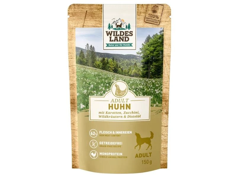 Hühnchenfleisch ist sehr fettarm und besonders leicht verdaulich. Deshalb eignet sich das magere Fleisch gut als Schonkost und für sensible Vierbeiner. Um Ihren Liebling nicht nur mit auseichend Proteinen und Fetten, sondern auch mit Vitaminen und Nährstoffen zu versorgen, enthält dieses Hundefutter Gemüsesorten wie Karotten und Zucchini. Karotten können gegen Durchfall helfen und Wurmbefall vorbeugen. Zucchinis sind voller Kalium, Kalzium, Magnesium und Phosphor. Um das Futter noch besser verdaubar zu machen, wird komplett auf Getreide verzeichtet. Verschiedenste Kräuter geben dem Nassfutter das gewisse Etwas und liefern viele Vital- und Mineralstoffe. Um auch das Fell und die Haut Ihres Hundes zu unterstützen, ist in der Rezeptur wertvolles Distelöl enthalten. Eine weitere positive Eigenschaft des Öles ist, dass es bei Juckreiz helfen kann. Ohne Zucker, Farb-, Aroma- und Konservierungsstoffe sowie zubereitet ohne jegliche Tierversuche können Sie dieses Futter bedenkenfrei an Ihren Liebling verfüttern und versorgen artgerecht und mit allen wichtigen Nährstoffen und Vitaminen für ein langes und belebtes Hundeleben.