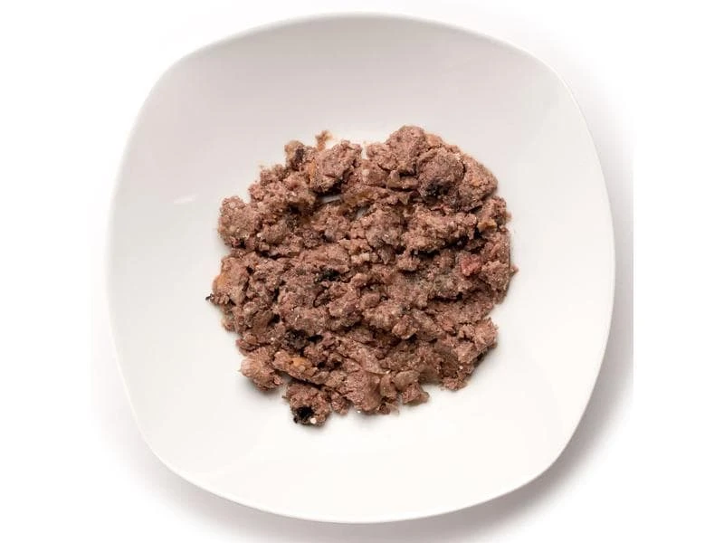 | Zusammensetzung | Rind 62% (Herz, Fleisch, Leber, Lunge, Pansen), Brühe 27.5%, Süsskartoffeln 4%, Karotten 3%, Heidelbeeren 2%, Mineralstoffe 1%, Distelöl 0.3%, Yucca-Extrakt 0.1%, Wildkräuter 0.1% (Basilikum, Kamille, Löwenzahn, Petersilie, Rosmarin). Zusatzstoffe: Vitamin D3 200 IE, Zink (Zinksulfat, Monohydrat) 25 mg, Mangan (Mangan(II)-sulfat, Monohydrat) 1.4 mg, Jod (Kalziumjodat, wasserfrei) 0.75 mg. |