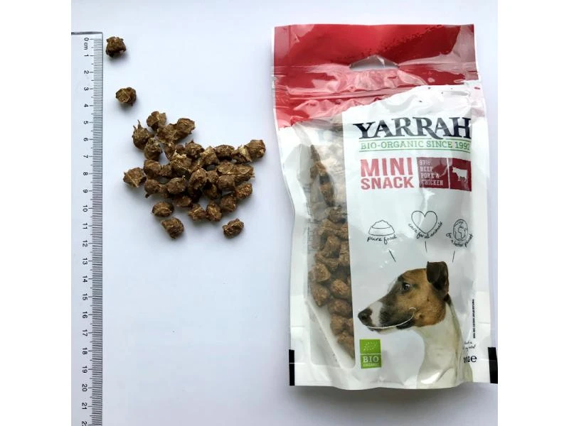 Der Yarrah Bio-Mini-Snack ist ein leckerer getreidefreier Hundesnack mit einem Fleischanteil von 97%. Hunde aller Rassen und Altersgruppen lassen sich gerne mit dem schmackhaften Snack belohnen oder verwöhnen. Er eignet sich auch hervorragend zum Trainieren Ihres Hundes. Ausschliesslich Bio-Fleisch ist enthalten – keine künstliche Zusatzstoffe, Pestizide oder Geschmacksverstärker. Der Snack befindet sich in einer praktischen wiederverschliessbaren Verpackung.